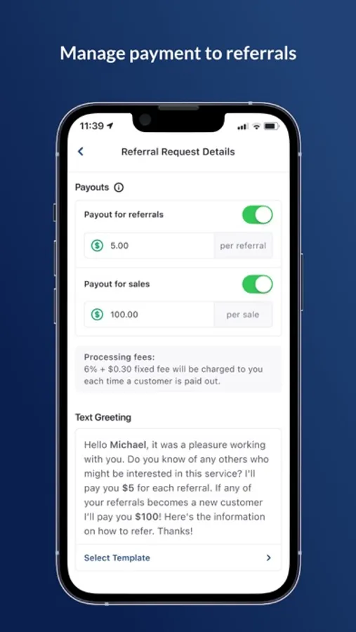 - Customize the text that is sent to the customer when you request a referral, or choose from a library of templates you can create