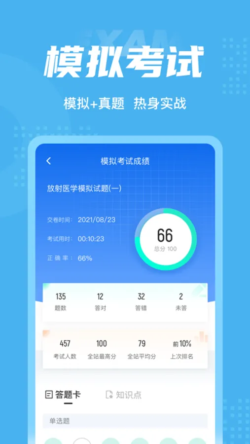 放射医学题库内含考点练习,全国通用卷以及地区卷模拟练习,以及按照固定考试比重的随机式的抽题的真题考场,成绩单实时记录考试数据,一点一滴的反馈考生近期学习状态以及自我正确率的提升,大大的给予考生通过考试的信心。