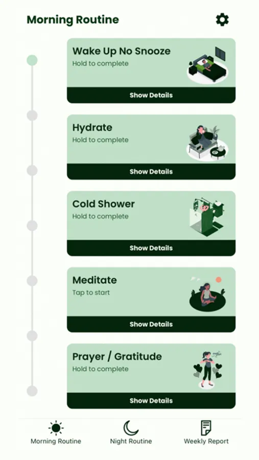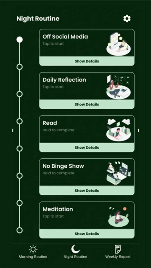 HabitApp uses the formation of the habit loop to help the user form each habit. The user can track their progress by checking the Weekly Report where the scores for the completion of the Morning and Night Routines can be seen. This is an indication of how the user has been able to put themselves in position to influence the outcomes that they desire. HabitApp’s aim is to help the user get into the habit of building habits by focusing on what is within their control and making the most out of the opportunities of each day no matter the setback.