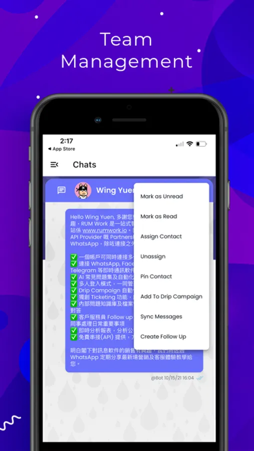 RUM work allow you to chat with your potential customers with team management, auto reply, AI chatbot. We would be packaging application with more and more features so please stay tune to future updates.