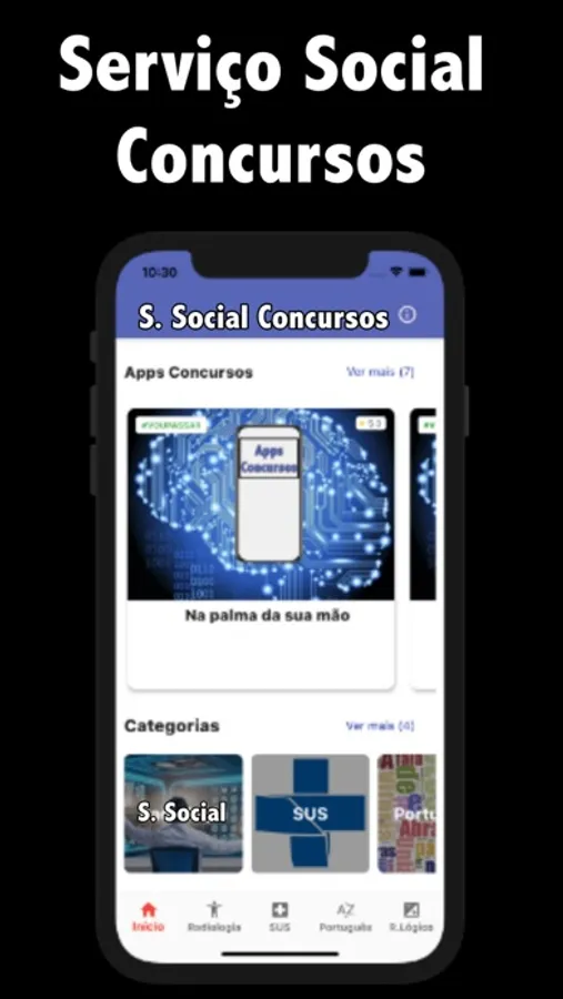 O App Serviço Social Concursos tem questões de: Serviço Social, SUS, Português e Raciocínio Lógico.