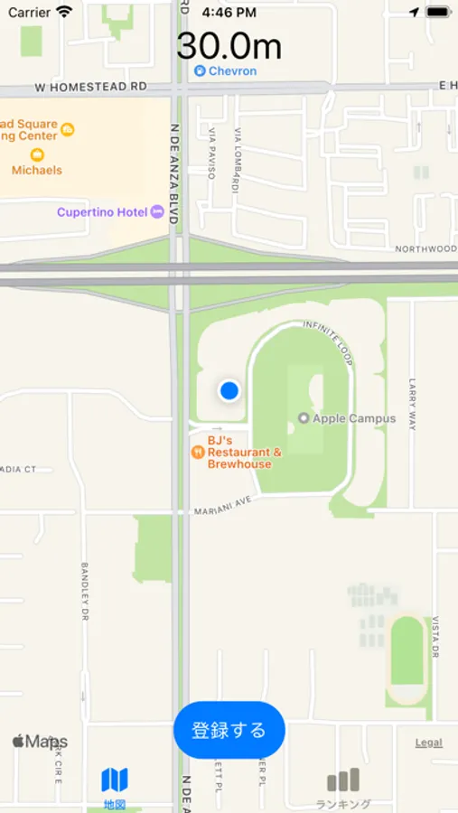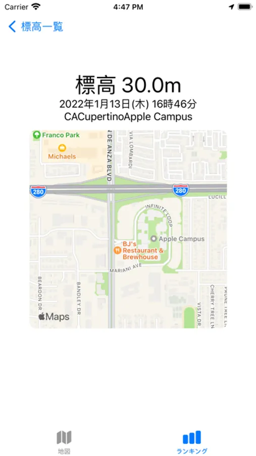 このアプリでは標高の保存ができるので、場所情報と標高を記録することができます。