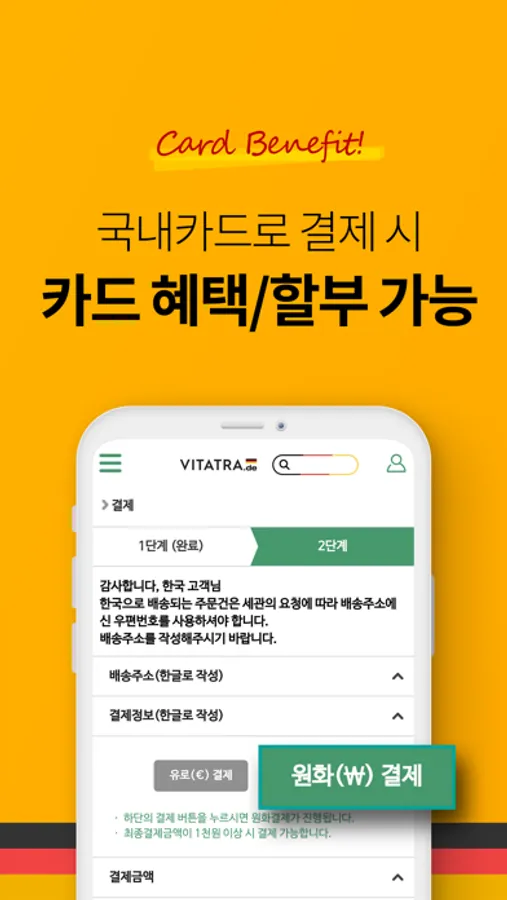 ■ 카드사 혜택 및 할부가 가능해외, 국내 PG가 연결이 되어있어 외화,원화 선택이 가능하며 카드사 혜택 및 할부혜택도 동시에 받을 수 있습니다.