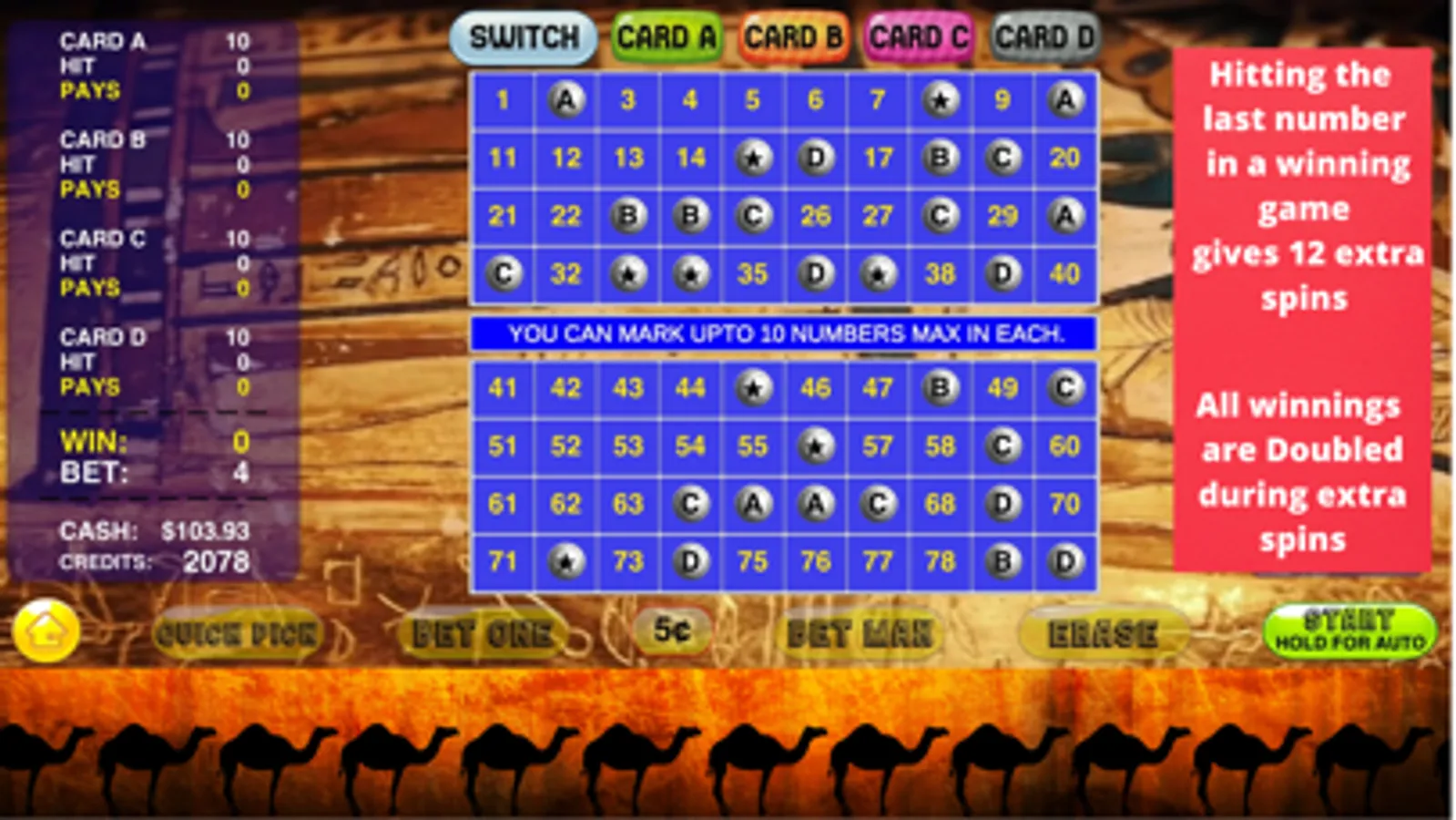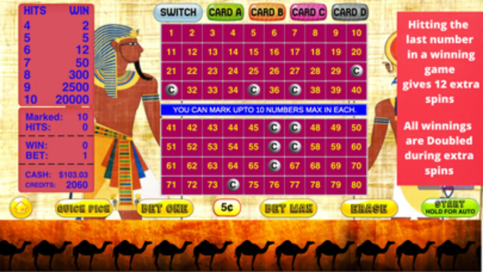 Play 4 card Cleopatra keno games. It is so much fun to play multi card keno games.