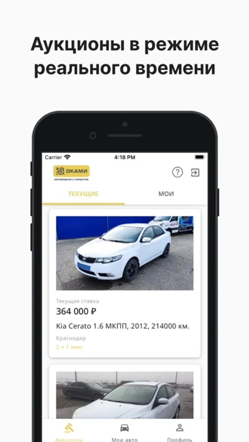 Приложение по продаже на аукционе автомобилей от компании Оками