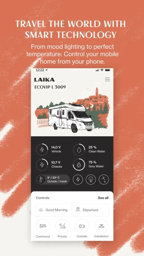 One app for a thousand destinations. The MyLaika app turns your Laika into a smart motorhome. Control your vehicle’s temperature, lighting, and more from your phone while on the go. The app makes it easy to set and adjust your personal preferences, and also keeps track of mileage, electricity, and water levels.