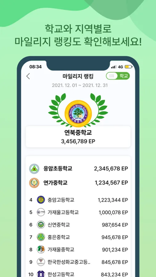 이번 달 에코왕은 어디~? 매달 진행되는 학교별/동네별 마일리지 랭킹! 물론 여럿이 모일수록 랭커가 될 확룔이 높아지겠죠~?