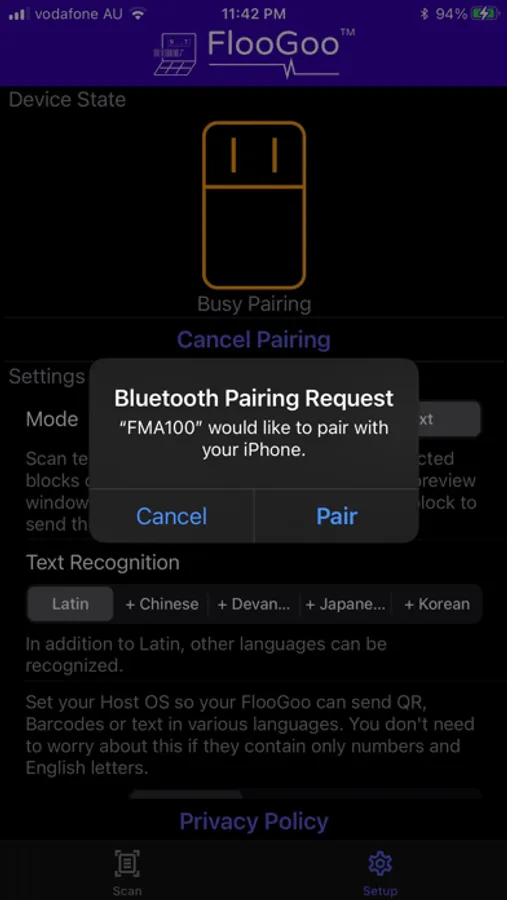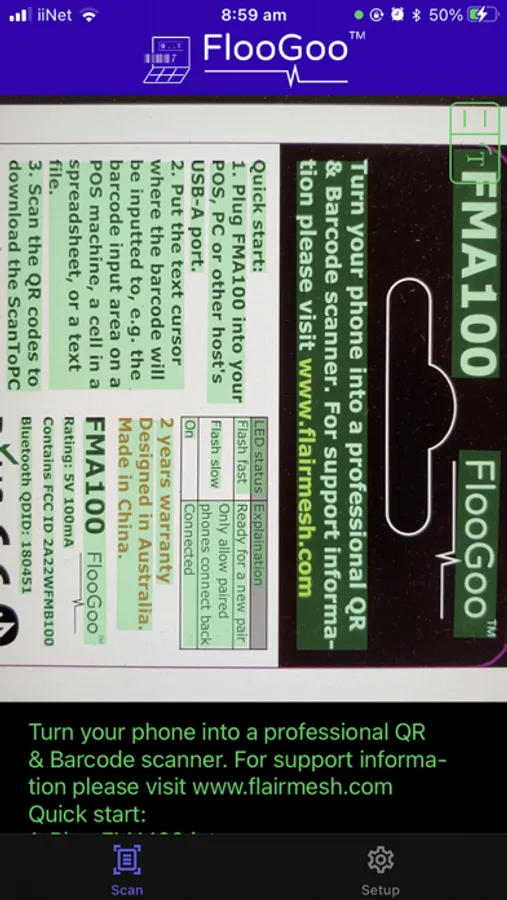 The app seamlessly scans text, QR codes, and barcodes, sending the data to host systems through our innovative FlooGoo FMA100 Bluetooth Dongle.
