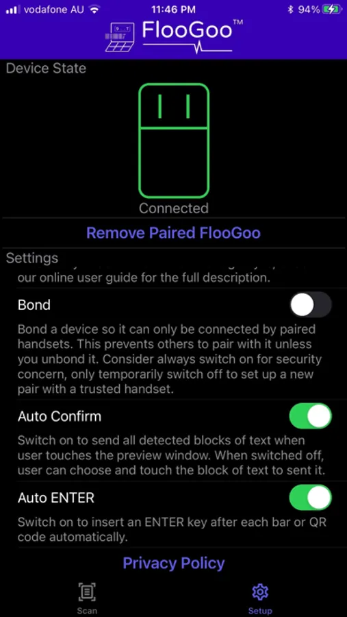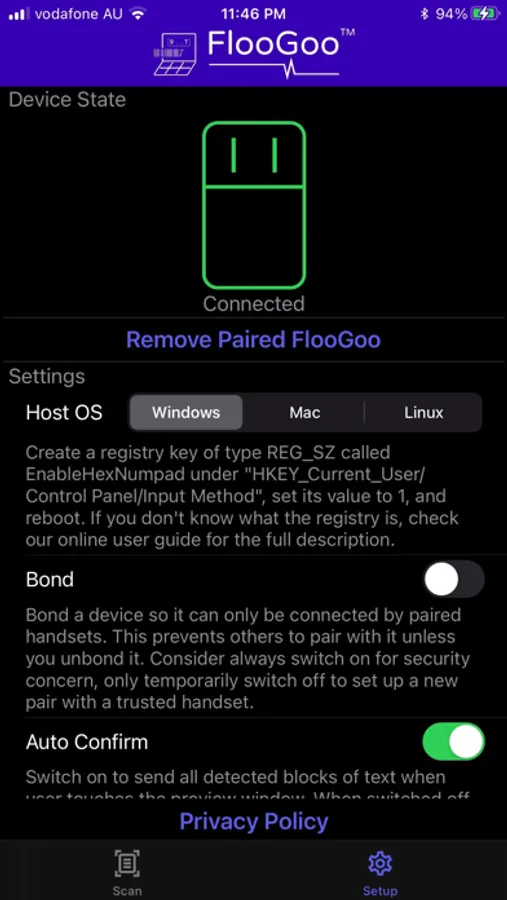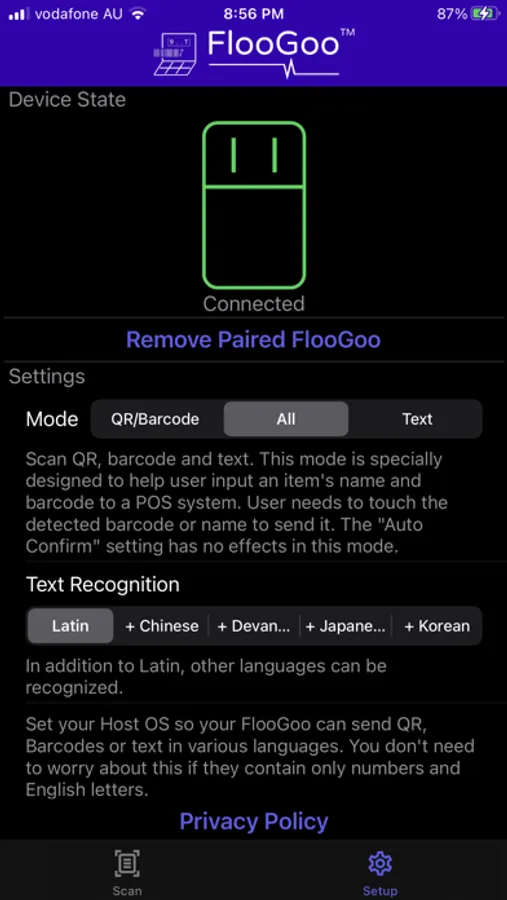 Scan text, QR codes, and barcodes effortlessly with the app and transmit the data to your host using a FlooGoo Dongle.