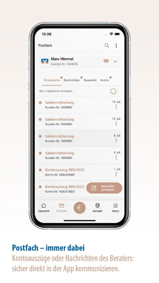 Die letzten Kontoauszüge oder Nachrichten des Beraters, alle direkt in der App über das Postfach abrufbar. Die Kommunikation erfolgt im Hintergrund sicher und verschlüsselt.