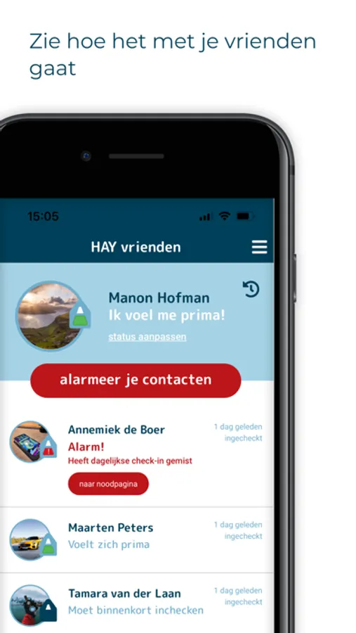 Je krijgt dagelijks een melding op je telefoon om in te checken, waarbij je aangeeft hoe het met je gaat. Jouw HAY – vrienden zien dan hoe het met je gaat en of ze actie moeten ondernemen.