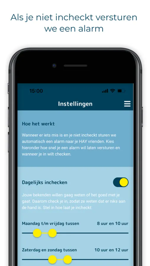 Je stelt zelf in hoe en wanneer jij wilt dat HAY – vrienden worden ingeschakeld. Dit kan zijn door in te stellen dat je op een vast tijdstip incheckt via de popup die je ontvangt. Als je niet incheckt krijg je eerst een melding op je eigen telefoon met het verzoek om in te checken. Als je niet reageert op deze melding gaat er een melding naar je HAY – vrienden. Je kunt zelf instellen hoeveel tijd er mag verstrijken voordat je HAY – vrienden een bericht krijgen dat je niet hebt ingecheckt.