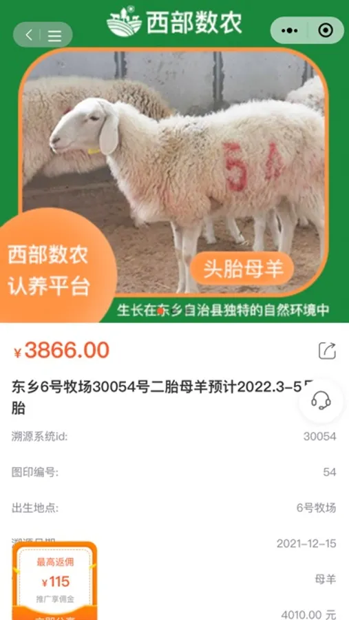 【自营牧场】选择西部数农牧场的羊只>进行认养,实时监控实时查看,即可开始体验当农场主>繁育羊只生产,获取收益,持续收益4-6年/育肥羊出栏,屠宰邮寄回家;育肥羊出栏,屠宰售卖。