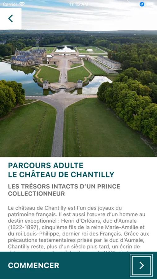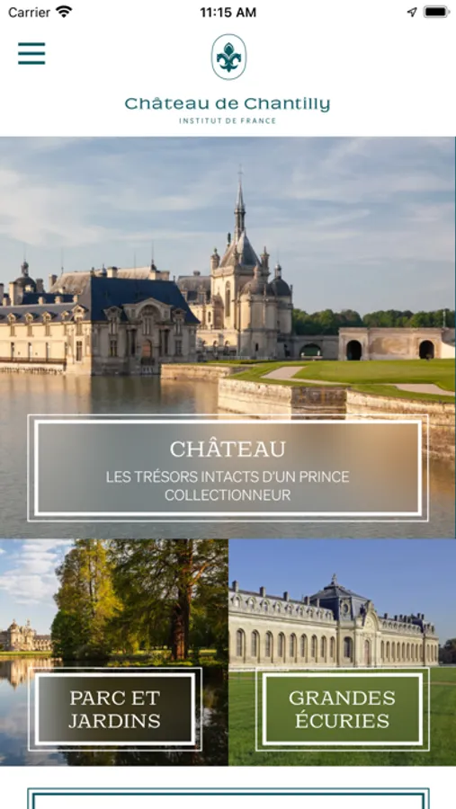 L’application officielle du Château de Chantilly. Entièrement gratuite. Elle comprend des versions « Adulte » et des versions « Enfant » en français et en anglais. L’application comprend des visites du parc et de ses jardins, du château et du musée Condé et des Grandes Écuries. Grâce aux commentaires audios, découvrez les circuits ouverts à la visite, les espaces prestigieux mais aussi les plus méconnus du Château de Chantilly. Des bonus textes ou vidéos facilitent votre compréhension des lieux. Grâce aux plans, vous trouverez facilement les services (toilettes, restaurants, boutiques) et les lieux incontournables à visiter, dans les jardins (anglais, à la française ou anglo-chinois).