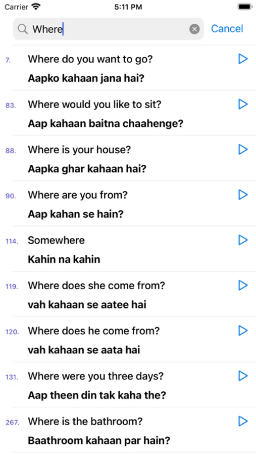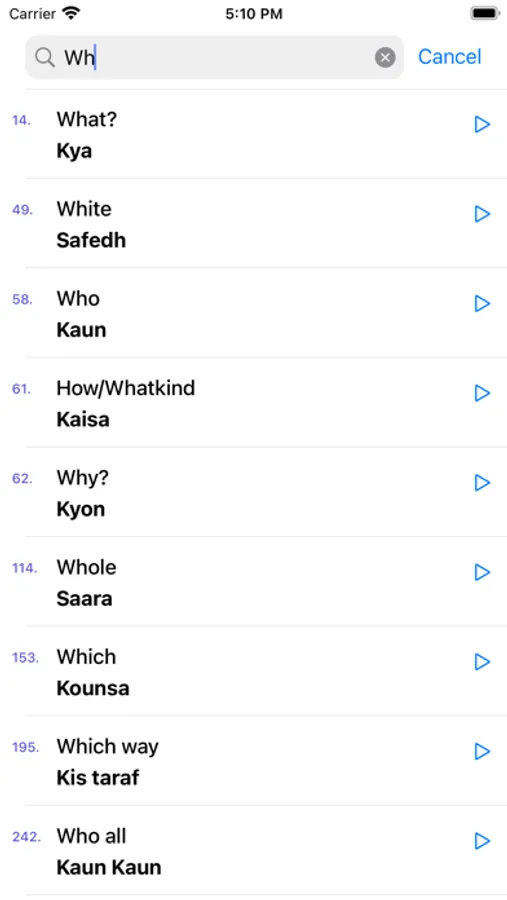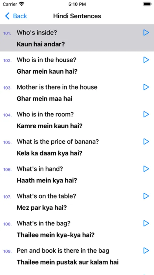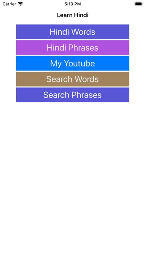 This app helps you to learn spoken Hindi through English without having to learn Hindi letters. It has 800 Hindi words & 300 daily used Hindi phrases/sentences with audio, so you can successfully learn Hindi on your own by downloading this app.