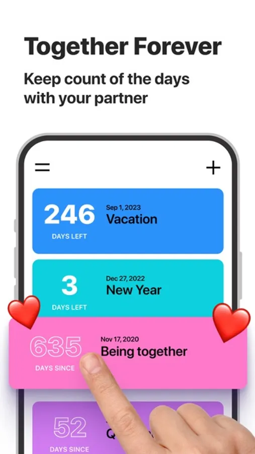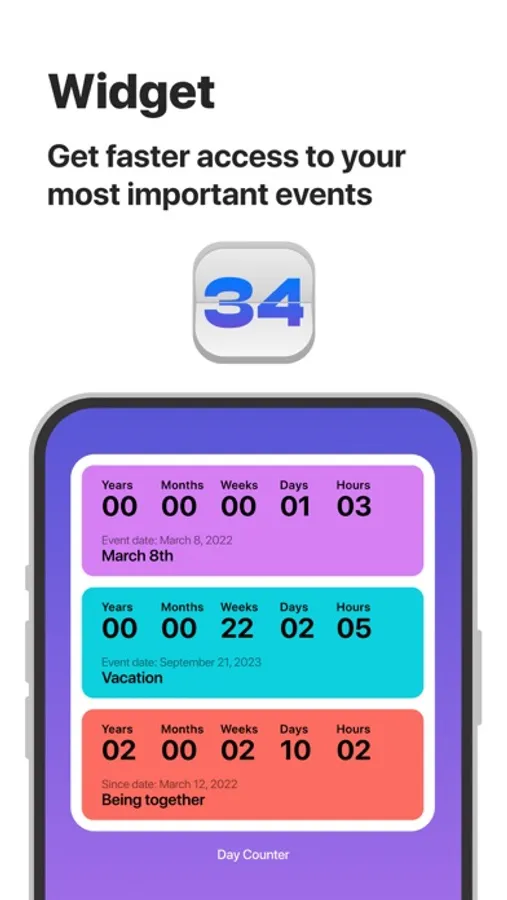 • Track the number of years, months, weeks, days, minutes, and seconds left to your important events