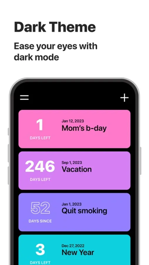 Days Counter works in two modes: count-up and countdown. You can use a countdown mode to stay up to date on the number of days until upcoming special events, which will help you be prepared without hassle. It facilitates you in tracking years, months, weeks, days, hours, minutes, and seconds until your events. Similarly, you can use count-up mode to track the number of days that have passed since you started a project or an event that facilitates your tracking progress. It has the option to count down the years, months, weeks, days, hours, minutes, and seconds since your events.