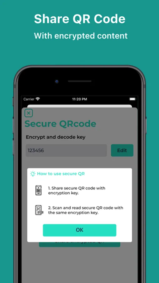 * Create and share QR code with a secret encryption key to keep your information absolutely safe.