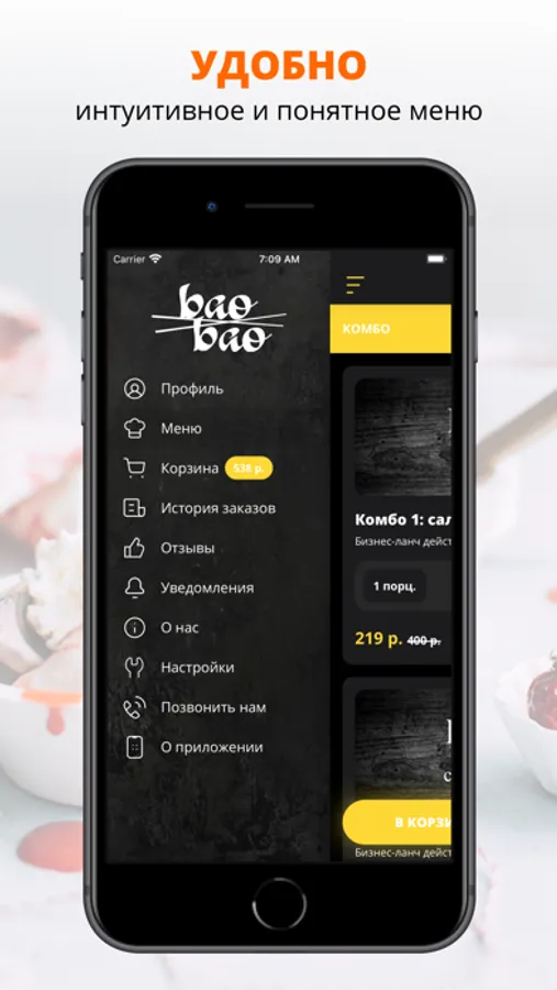Приложение BAOBAO — это удобный способ заказа еды домой или в офис! Мы готовим наши блюда из качественных свежих ингредиентов и доставляем еду по Екатеринбургу быстро и бережно.