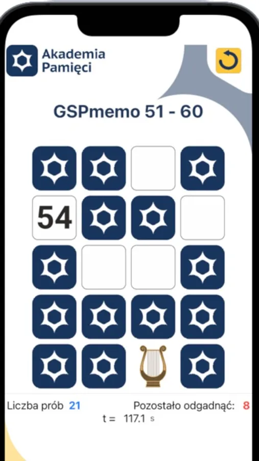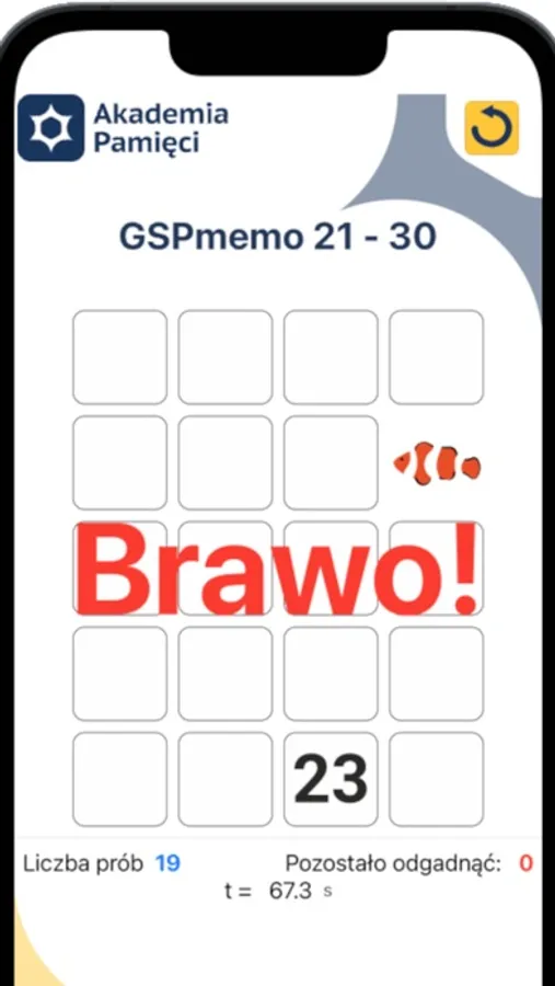 Trening doskonali poznane zakładki GSP oraz rozwija pamięć przestrzenną. Trenuje się zestawami po 10 obrazów i 10 odpowiadających im liczb.
