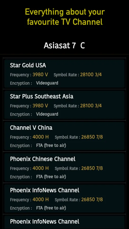 TV Channels Data contains Satellite information, Frequency, Symbol Rate, Biss or Power VU Keys.