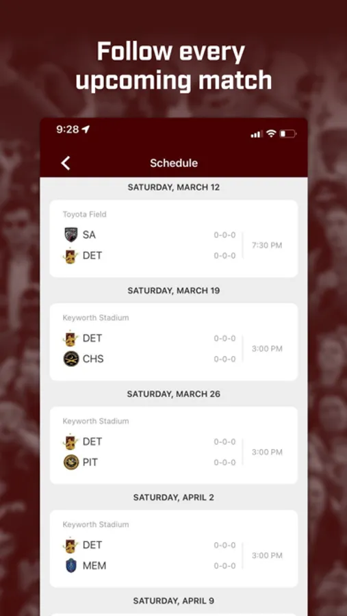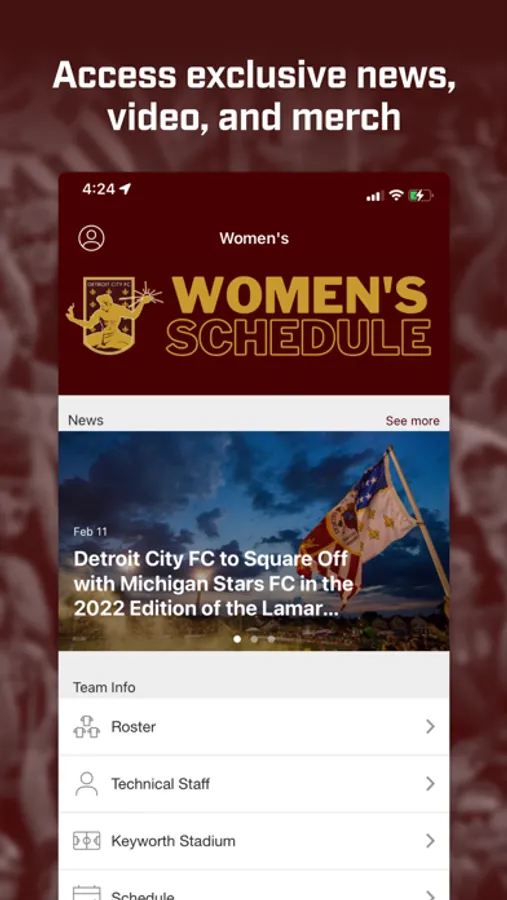 Access the team schedule, view player updates, watch the best highlights and get prepared for matchday with your favorite USL club: Detroit City FC.
