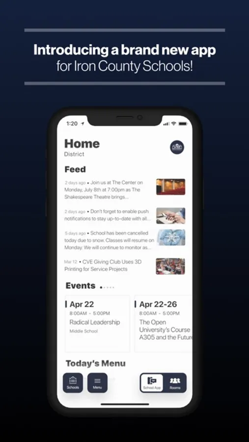 The event section shows a list of events throughout the district. Users can add an event to their calendar to share the event with friends and family with one tap.