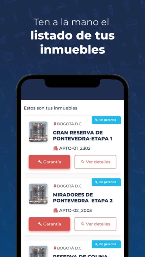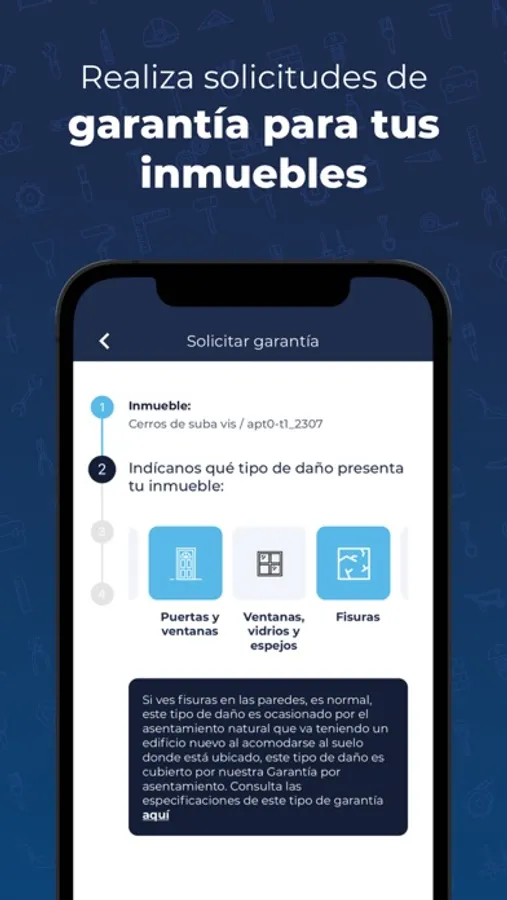 Principalmente, los clientes de AR Construcciones, podrán registrarse de forma gratuita en nuestra app Tutto, simplemente ingresando su nombre, correo electrónico y documento de identidad, una vez los clientes realizan el registro, podrán acceder a la función principal de esta versión inicial de la aplicación y es la solicitud de servicios de garantía para cualquiera de los inmuebles asociados a su cuenta Tutto, en 4 pasos: 1. Selección del inmueble a solicitar la garantía. 2. Selección de tipo de daño que presenta el inmueble, 3. Selección de tipo de llamada de soporte que quiere recibir el cliente, puede ser llamada de voz o llamada de video. 4. y por último Número telefónico al que quiere ser contactado.