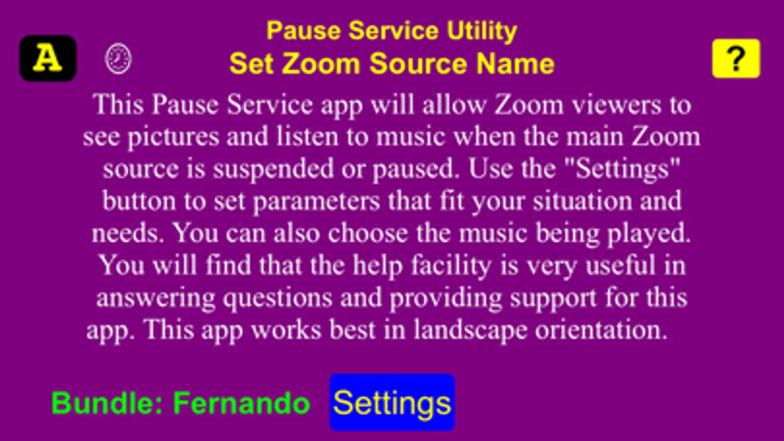 This is a utility to allow those hosting a Zoom session to show pictures and play music when the Zoom session is paused for any reason, thus allowing the users to know that the session is paused and will resume soon. This app runs on both the iPad and iPhone and should be used in Landscape orientation.