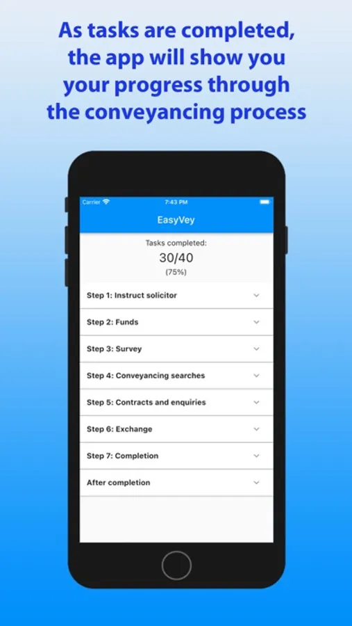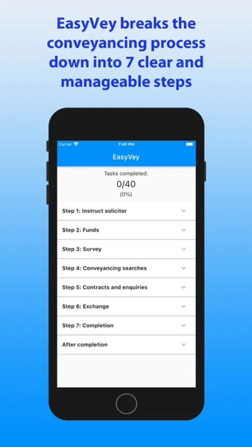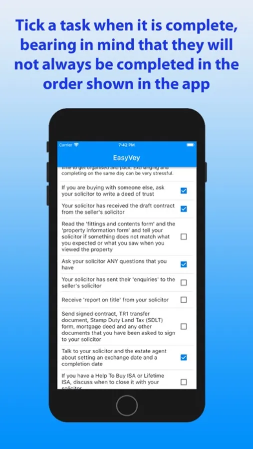 EasyVey hopes to change this. This simple app breaks down the entire conveyancing process into 7 simple steps. Each step contains a number of tasks that need to be completed. Tick these tasks off as you complete them and EasyVey will tell you how far through the conveyancing process you are. Don't worry if you do not tick off all the tasks in order, the order of tasks may vary slightly depending on your circumstances and the property you are buying.