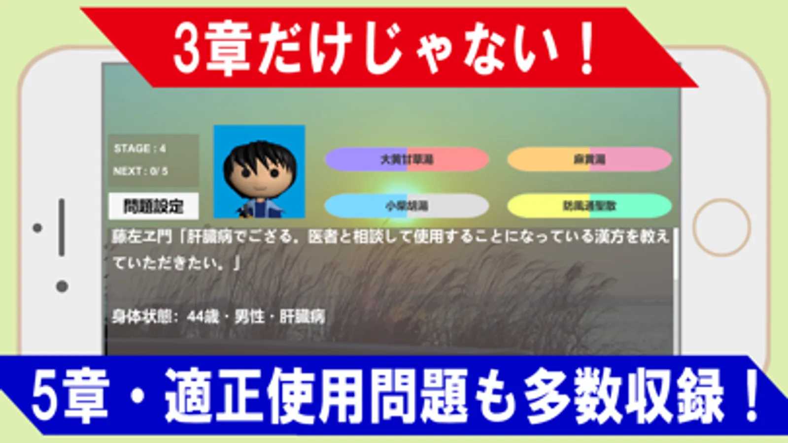 間違えた問題のみを出題したり、生薬や漢方問題を集中的に学習するモードもあります。第5章の適正使用問題にも挑戦できます。