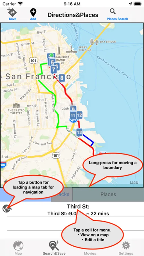 Enlarged map at the cross road, alarm sound and saving data are added. You can save and upload to icloud the searched directions.
