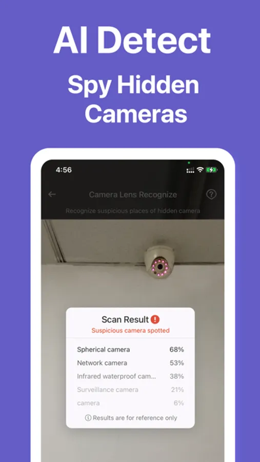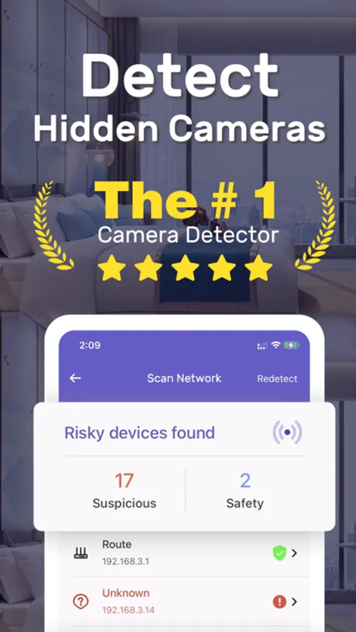 Hidden Camera Scan the suspicious devices under the current network with one click to find Spy hidden cameras, so that you can stay safe and private! Anti-sneak shooting strategy, tell you which suspicious places are easy to be sneaked, check before you move in!