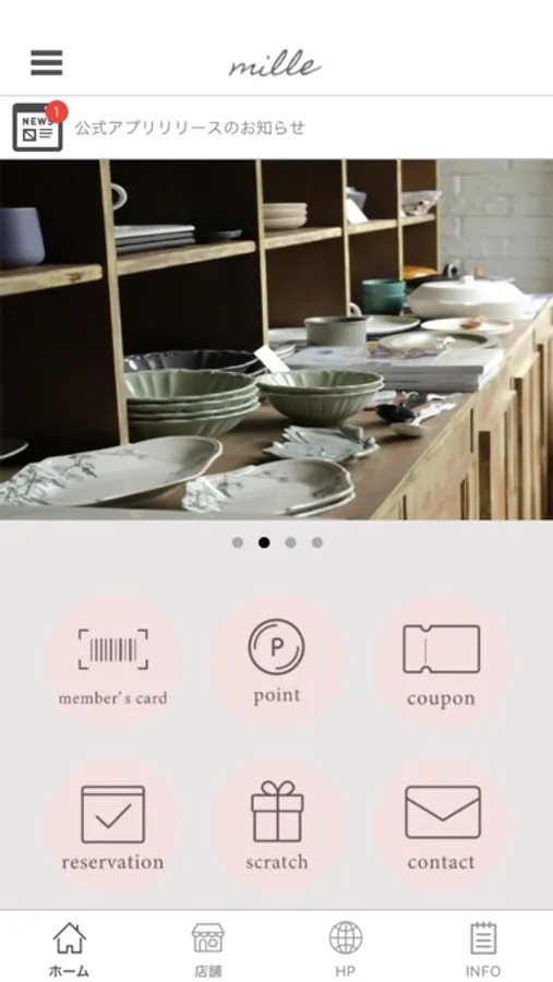 「mille」ではお店からの最新情報をお届けするほか、お店で会員証をご提示いただくだけでお得なポイントもたまります。アプリ会員様は限定クーポンがご利用いただけます。
