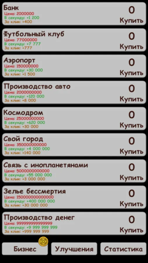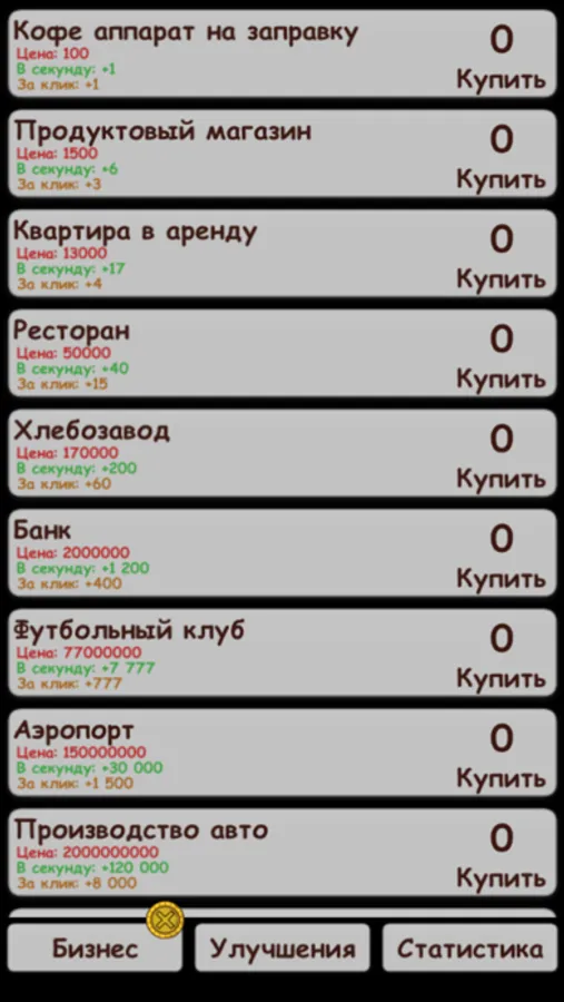 - Использовать улучшения, увеличивающие монеты за клик и в секунду.