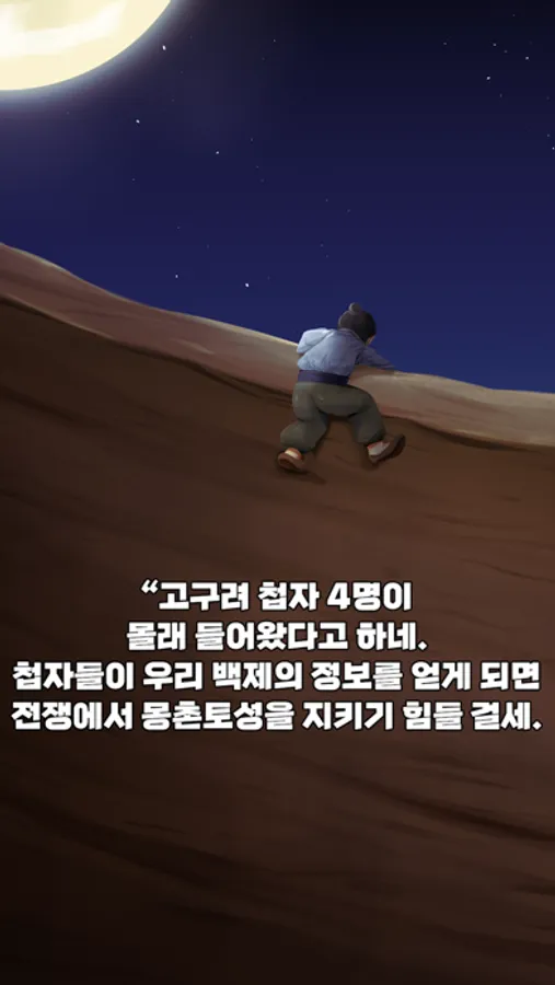 “내가 가장 신뢰하는 자네를 보내니, 백제 몽촌토성에 들어온 고구려 첩자들을 당장 잡아오게.”