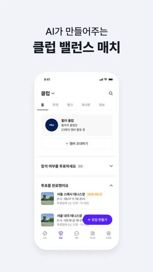 클럽 모임 투표부터 대진 생성까지 AI가 알아서 관리해주는 원스톱 클럽 관리!