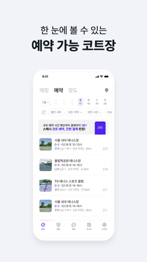 테니스 친구찾기부터, 테니스 코트 예약, 초보자를 위한 레슨 예약, 그리고 테니스 클럽 기능까지