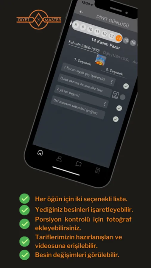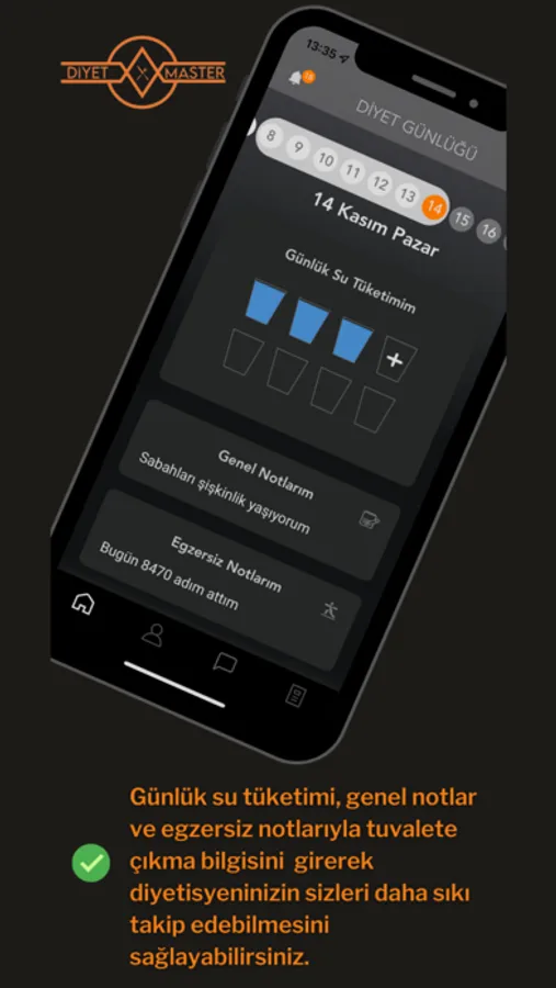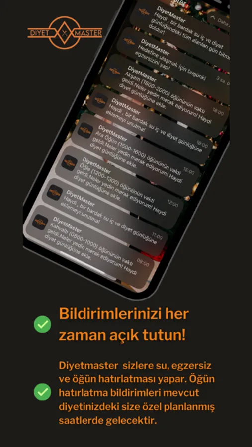 Uygulamamızda su ve egzersiz bildirimlerimizin yanı sıra size özel öğün hatırlatıcılarımızla diyetinizi kolaylaştırıyoruz. Satın alım yaptığınız diyetinizin özelliklerine göre yemek saatlerinizde size özel bildirim gönderilecektir. Yoğun iş temposu olan ya da unutkanlık yaşayan kullanıcılarımıza teknolojimizle destek oluyoruz.