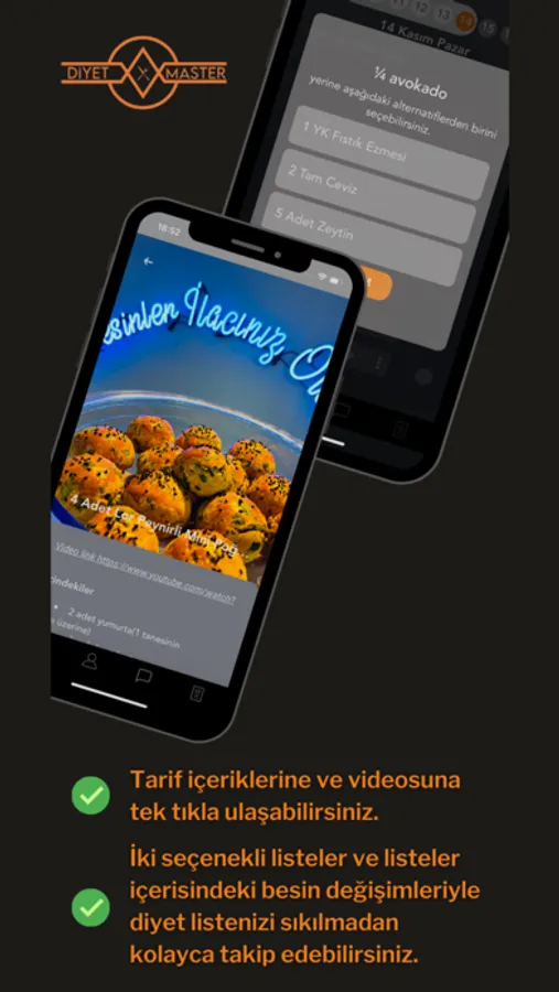 Tek bir listeye bağlı kalmadan her öğün İKİ FARKLI LİSTE, BESİN DEĞİŞİMLERİ VE TARİFLER ile sınırsız seçenek oluşturabileceğiniz, diyetten hiç sıkılmayacağınız ve aç kalmayacağınız ilk ve tek diyet programı. Bununla birlikte liste değişiminiz için tek yapmanız gereken diyetisyeninize yazmak! Diyetisyeniniz de diyette tercihlerinizi görecek ve sizlere tercihleriniz doğrultusunda önerilerde bulunacaktır.