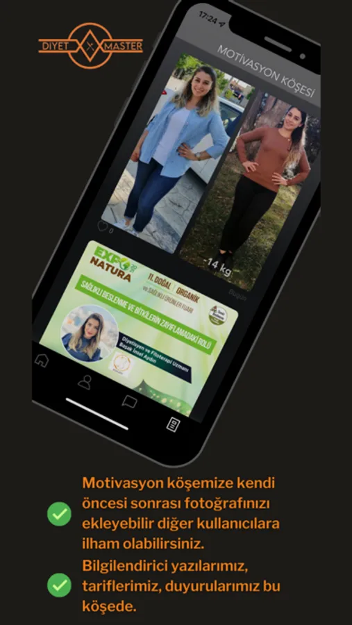 Uygulamamızdaki motivasyon köşesi bölümümüzde oluşturduğumuz içerikleri, tariflerimizi ve sağlıklı beslenme sürecinde bizlerle olan danışanlarımızın değişim fotoğraflarını görebilir, sizler de fotoğraflarınızı paylaşarak diğer kullanıcılarımıza ilham olabilirsiniz.