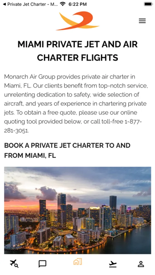 Monarch Air Group provides private air charter in Miami, FL. Our clients benefit from top-notch service, unrelenting dedication to safety, wide selection of aircraft, and years of experience in chartering private jets. To obtain a free quote, please use our online quoting tool provided below, or call toll-free 1-877-281-3051.