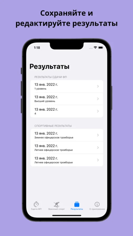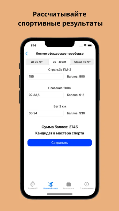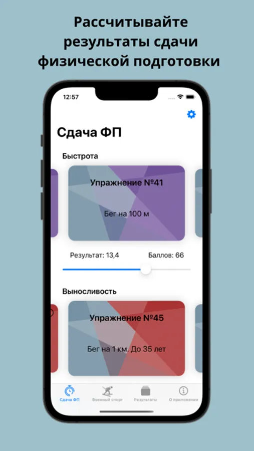 Приложение Военспорт НФП позволяет рассчитывать результаты сдачи физической подготовки в соотвествии с Приказом Министра обороны РФ от 21 апреля 2009 г. N 200 "Об утверждении Наставления по физической подготовке в Вооруженных Силах Российской Федерации" с изменениями от 31 июля 2013 г.