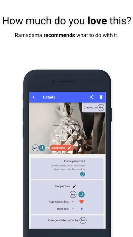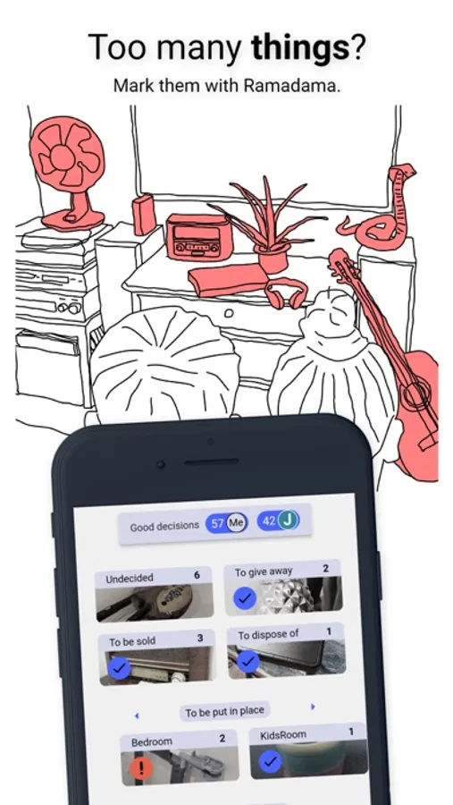 Ramadama helps you decide: Is that a beloved thing oder can it go? Cleanse your household together: Up to 3 Players can add items to a household. The app helps you to solve conflicts and to keep an overview.