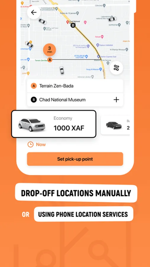 Allons-y is a Chad private taxi in N'djamena, Tchad. Allons-y helps users book a Chad private taxi for rides by entering pickup and drop-off locations manually or using phone location services in N'djamena, Tchad.