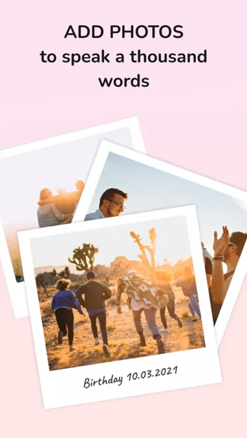 You can write your thoughts, feelings or experiences and attach photos. Even little notes each day help to organize your inner thoughts and gain clarity on your priorities.