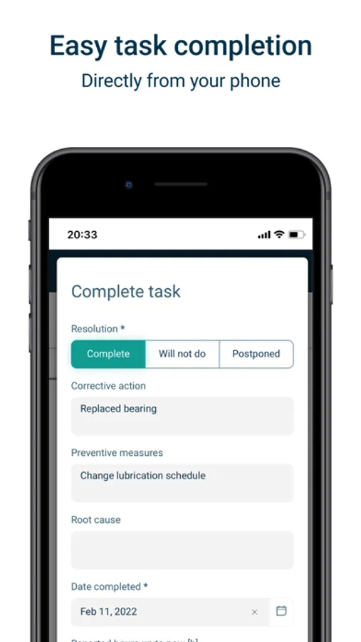 Create and document corrective maintenance tasks while standing in front of an asset and keep track of cleaning, lubricating and maintenance.