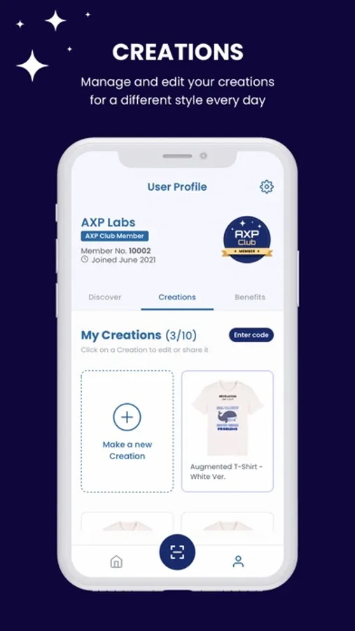 * The “RÉVÉLATION” Augmented T-Shirt is a world exclusive product from AXP Origin, the first ever fully customizable t-shirt that lets you upgrade your style to the next level. Create and edit your own designs with AXP Scan and display them with AR to show a new side of yourself every day, without ever having to buy another t-shirt.