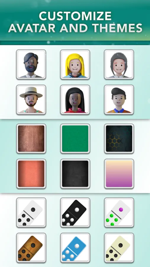 A great selection of board design and domino tiles themes for you to choose from. Customise your avatar and choose a country. Play to win coins and unlock them all.