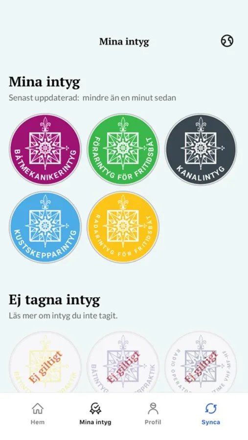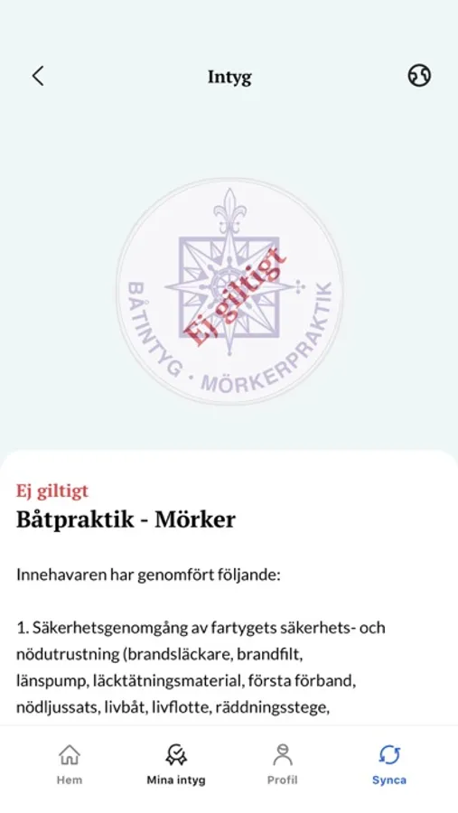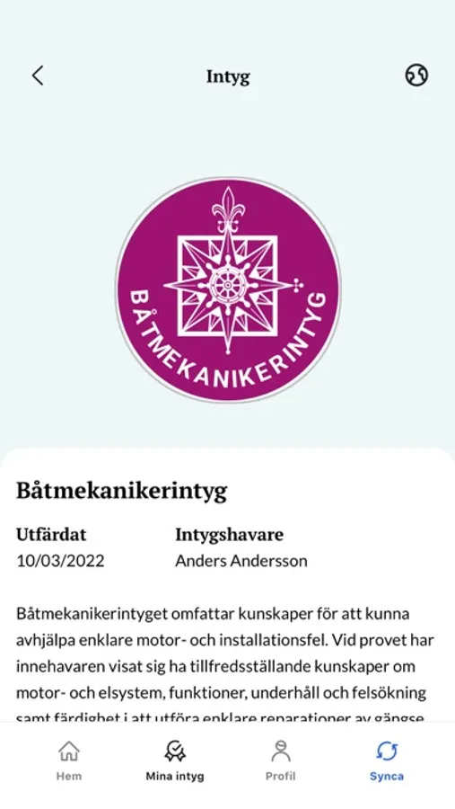NFB Båtintyg är en digital intygsbok som innehåller bevis på godkända intyg. För varje intyg finns detaljerad information om vilka kunskaper som krävs för att få intyget. För samtliga intyg finns översättningar till engelska, tyska, franska och spanska. Visningsspråk väljs enkelt genom att klicka på den lilla jordgloben längst upp till höger i appen. NFB Båtintyg är en digital version av den gamla Blå intygsboken.